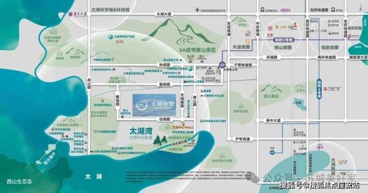 生态配套:1 公里可直达太湖湖滨国家湿地公园,周边 3 公里内还有 37 个公园,同时北靠穹窿山 5A 级风景区,南临太湖,生态休闲资源丰富。