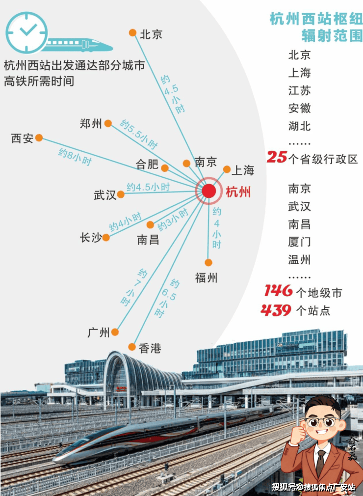 作为杭州市唯一特级TOD,城西科创大走廊核心节点。依托高速铁路辐射整个长三角区域,串联杭州、上海、南京、合肥、温州等大型城市,打造“浙江省1小时交通圈、长三角2小时交通圈”。最快班次可实现63分钟到上海、84分钟到温州、4.5小时到北京。待沪乍杭高铁建成,西站还将实现40分钟到上海。(数据来源:12306;杭州市人民政府)