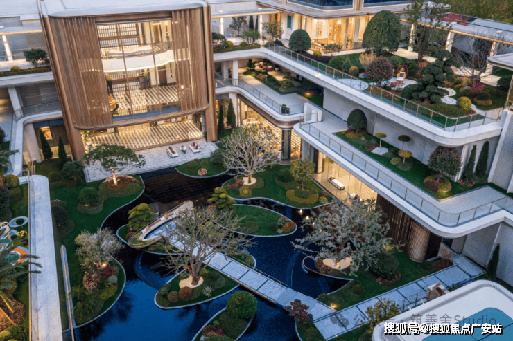 小区大门以“云扉初开”为灵感,打造具有仪式感的礼仪入口。宽约66米、高约8.6米的恢弘门庭,与酒店式归家大堂共同构筑,打造出极具仪式感的序厅,瞬间开启归家的尊崇心境。入口处精心打造的树阵水院,以静谧尊贵的氛围迎接归家。巧妙运用高差设计,通过层层递进的景观节点,优雅地引导业主步入社区深处。