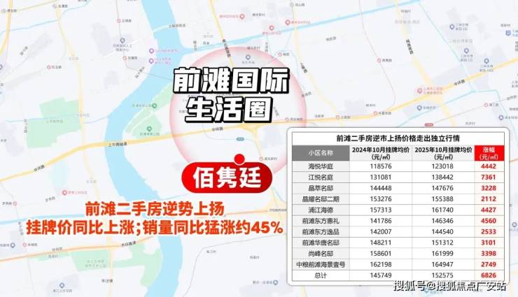 价格上,在约98%板块挂牌价同比下降的当下,前滩多数小区仍保持价格坚挺;销量上,今年1-10月二手房成交约230套,同比大涨约45.6%,印证板块吸引力。