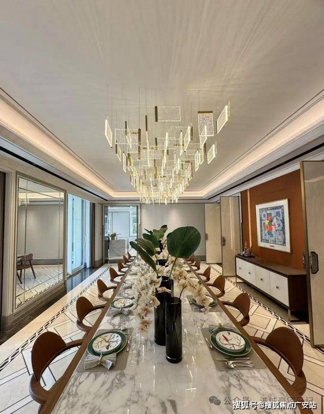 餐厨空间 开放式厨房配中岛台,餐厅吊顶做石膏浮雕收边,长桌长度建议≥2.4米