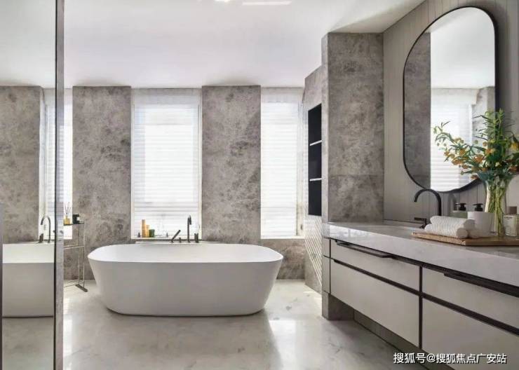 主卧的浴室通过大面积的开窗来将光线引入室内,纯白色的浴缸与大理石墙壁相对应,突出艺术性、时尚感,场景不在遵循传统意义上的布局。