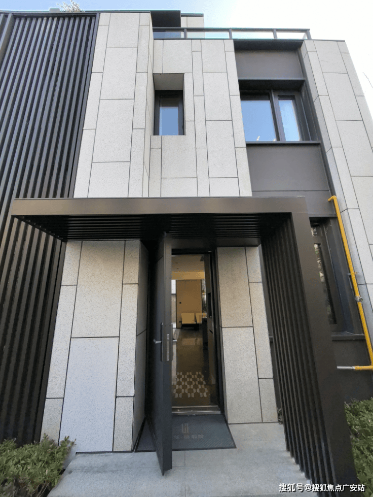 The exterior wall of the villa is equipped with a metal fence, and there is a lot of greenery inside.