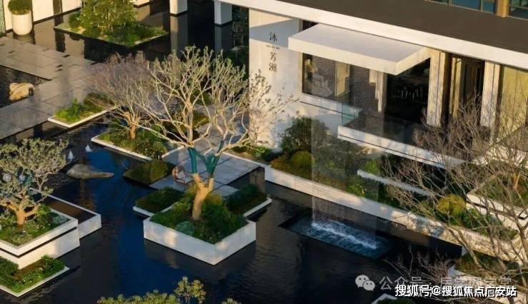 项目将大面水景置于社区前场,结合绿植、流瀑、雕塑等,构筑了令人印象深刻的入口界面。