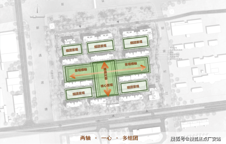 在1.8容积率、限高50米的条件下,规划采用“两轴·一心·多组团”的结构,摒弃传统兵营式布局。通过错落排布10栋高层,优化每户日照与通风,并在社区中央形成集中景观核心。多个居住组团围绕景观核心分布,构建层次分明、归属感强的空间序列。