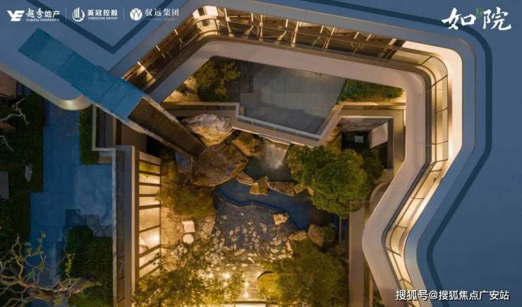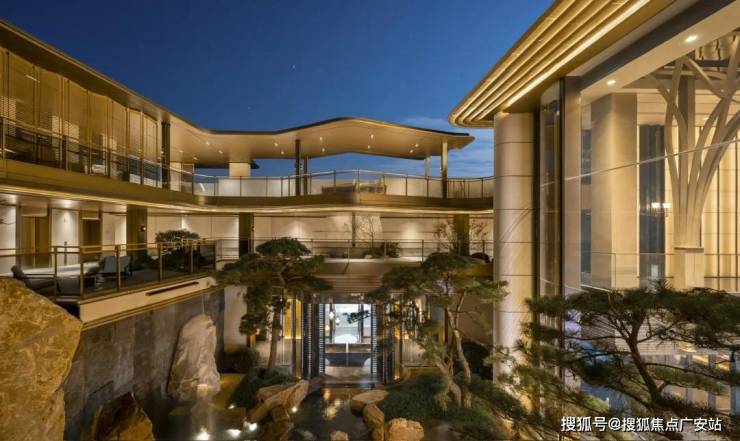 以水、风雨连廊、空中悬挑平台串联山水相依风雅景致 , 呈现三层立体园林及 约15 米飞石叠瀑景观,营造出丰富的空间层次感,中央布置大面积立体水景,如诗如画。