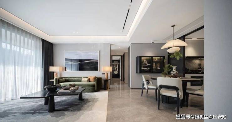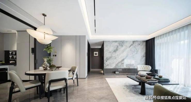 走进客厅,印象最深的除了大手笔岩板背景墙,就是区域唯一的悬浮吊顶,得益于标准层3.1~3.15米层高,一楼更是做到3.6米层高,即便做了吊顶,也丝毫不影响大宅气场.