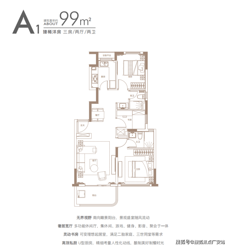 独立玄关、U型厨房、主卧大套间、三开间朝南大面宽等均为标配,堪称140㎡段的“完美四房”。