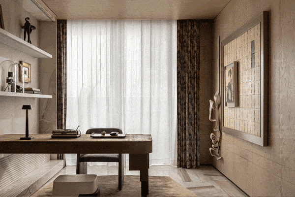 茶室是这个样板间的一大亮点,也是宋氏美学风格的集中体现。木质的地板让整体感受温润舒适,墙面局部挂着书法作品,为茶室增添了浓厚的文化氛围。
