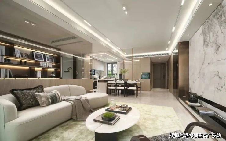 而在硬性标准之上,保利·海上瑧悦还充分融合了东方文化高定细节!比如说,客厅整面交付的大面积岩板背景墙均为东方定制款式,采用的是水墨丹青和徽州印象样式,配色风格凸显东方风雅;