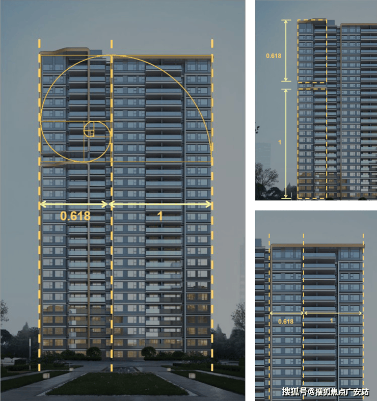 塔楼设计,提取圆润的玉造型和白金的配色。“金镶玉”使建筑立面变得更为柔美,圆弧铝合金转角线条,形态上暗合珠圆玉润的传统美学意韵,代表一种温和雅丽尊贵典雅的审美价值取向。从文化内涵角度,圆弧图形寓意圆融通达,顺遂平安,体现一定的传统文化内涵。立面上中下三段式黄金分割比例,具有严格的比例性、艺术性、和谐性,蕴藏着丰富的美学价值。