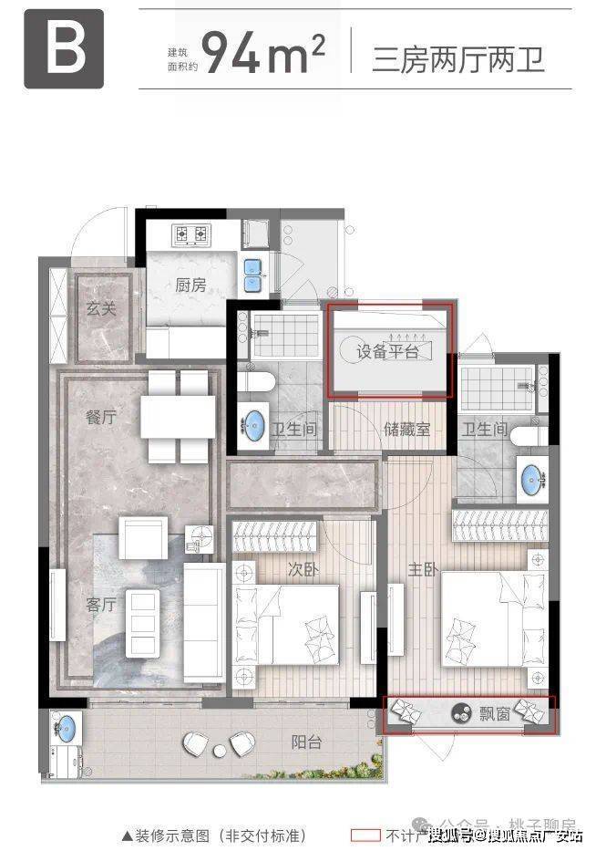 建面约94㎡三房两厅两卫: