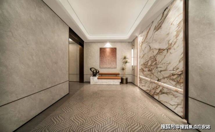 比如它的单元大堂,地面不是简单通铺,而是用上了定制波浪纹地砖,再用弧形金属波打线收边,质感特别高级。