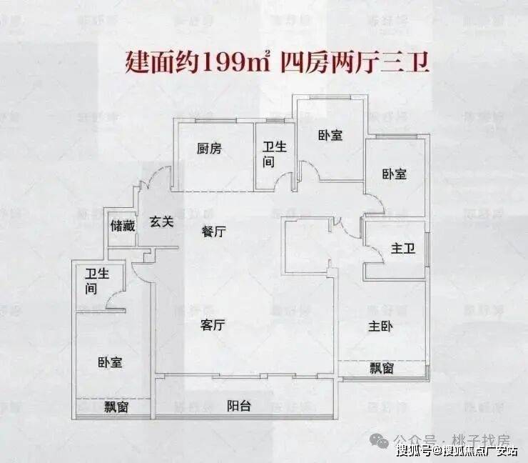 该户型图为四房三卫的格局,进门即独立玄关,仪式感强,还自带小储藏间,便于业主收纳、整理。南向连通阳台,采光视野都很不错。双套房设计,其中大套房带独立衣帽间。满足三代同堂的居住需求。