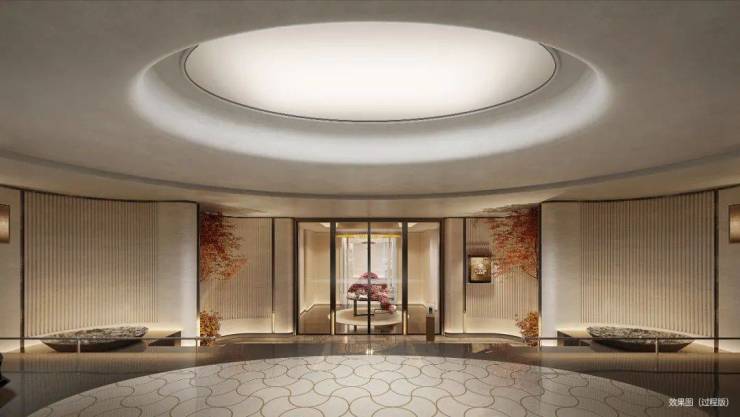 约32米气派门厅,入口采用三重弧形石材墙体+圆角幻彩穿孔顶,四重酒店式归家厅堂,让每一次归家都充满仪式感。