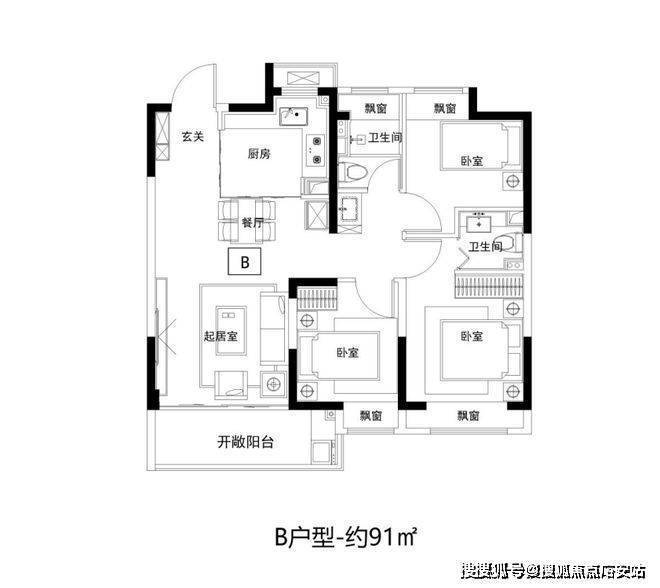 建面约91㎡3房2卫,三开间朝南,客餐厅连通大阳台,四飘窗设计,好户型该有的素质它都有。