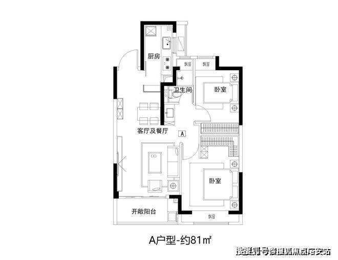 建面约81㎡2房功能齐全,拥有朝南大面宽和全卧飘窗设计。