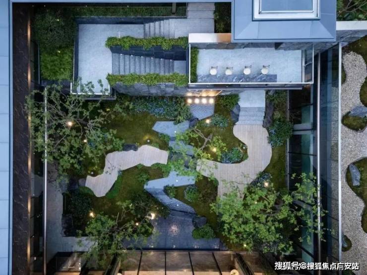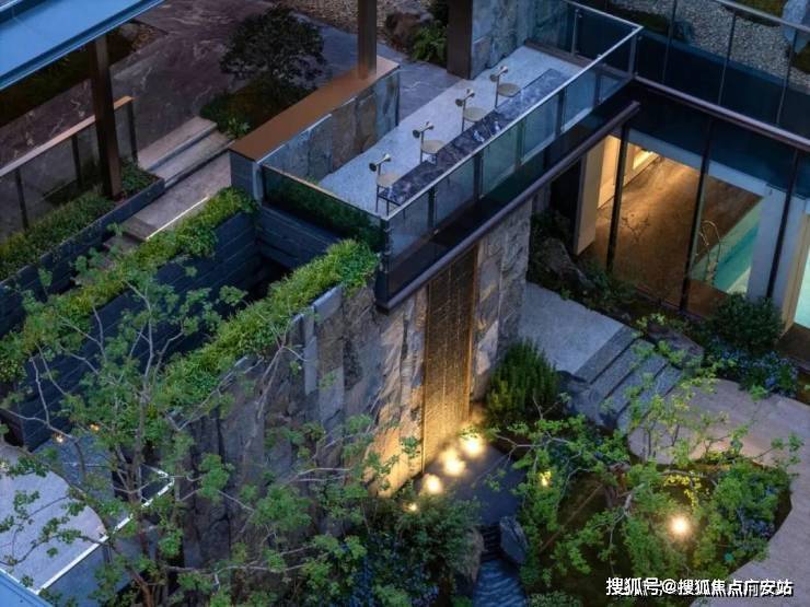 里面点缀着特选黑松、羽毛枫、4棵乌桕等,以及采用约40吨自然石皮面打造的垂直立面墙,整个庭院犹如立体山水画卷,每一个角度都有不一样的风景。