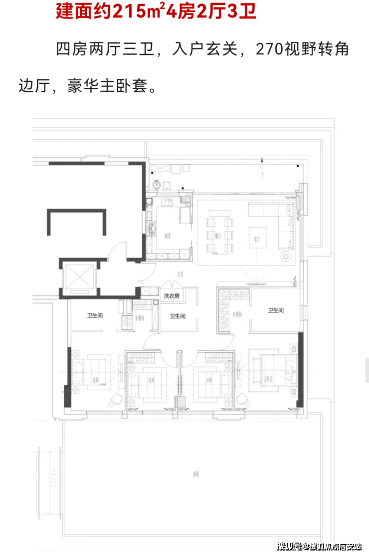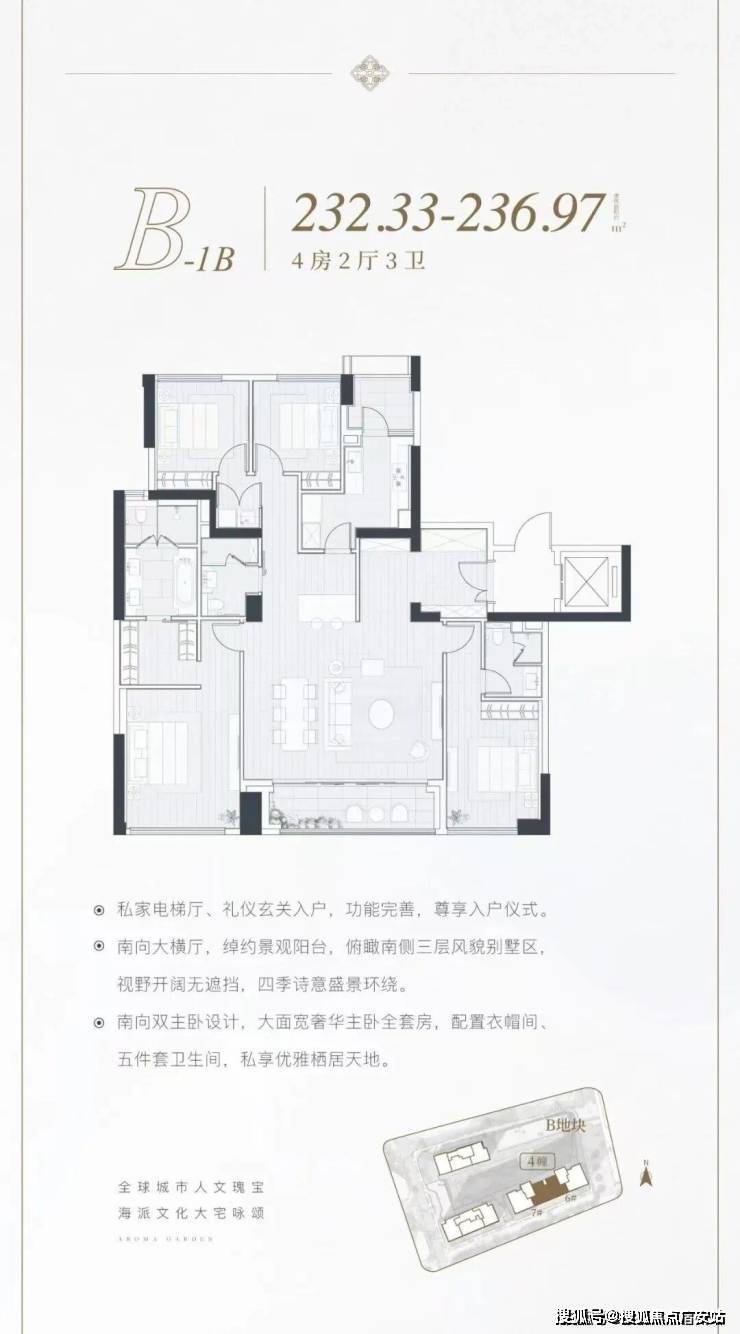 建面约216-254㎡四房(共74套):四叶草布局(四房互不干扰),动静分区,豪华主卧套房(含衣帽间、双台盆浴室、观景飘窗),270°转角边厅(落地玻璃窗),尽揽外滩天际线与园林水景。