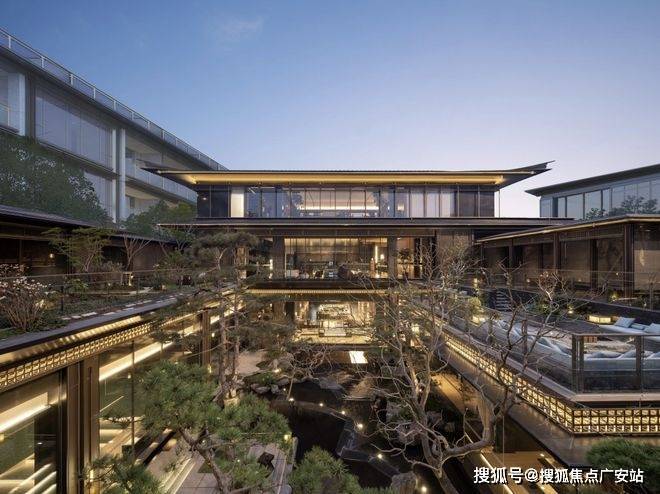建筑立面:古今交融的诗意表达:外立面以香槟金铝板为基调,搭配蓝眼睛石材与玻璃幕墙,融合传统歇山重檐、纳福悬鱼等元素,既保留宋式建筑的对称美学,又赋予现代建筑的轻盈通透。合院组团采用三面庭院设计,L型景观面与环绕式檐廊,将超山梅影、丁山湖光引入每一扇窗景!