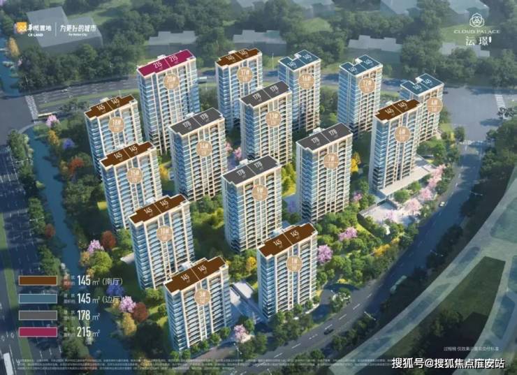 小区规划15幢住宅,包括2幢14层、1幢15层、1幢16层、10幢17层及1幢18层,整体呈北高南低、轴对称布局。户型设计以改善型为主,共提供145㎡、178㎡、215㎡三个面积段。项目定位偏向中高端改善市场,建筑布局和立面风格注重品质感,符合现代住宅审美趋势。