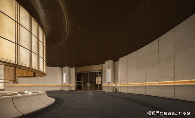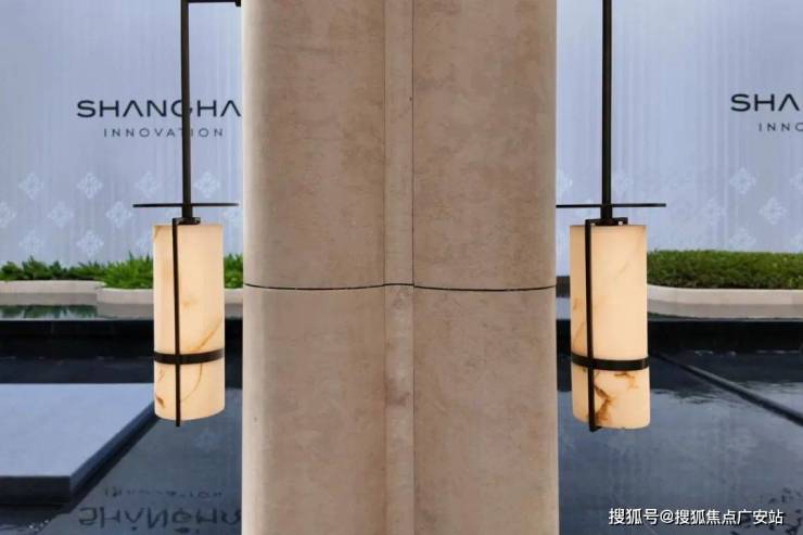 招商序藉由“吴淞灯塔”及其形制,原创落客雕塑“源流”,保加利亚进口的沉香米黄石材的底座,搭配以安哥拉黑大理石、云石玻璃,营造温润归家昭示。整个前庭形成艺术感与实用性兼具的环岛式落客区,进一步提升仪式感。