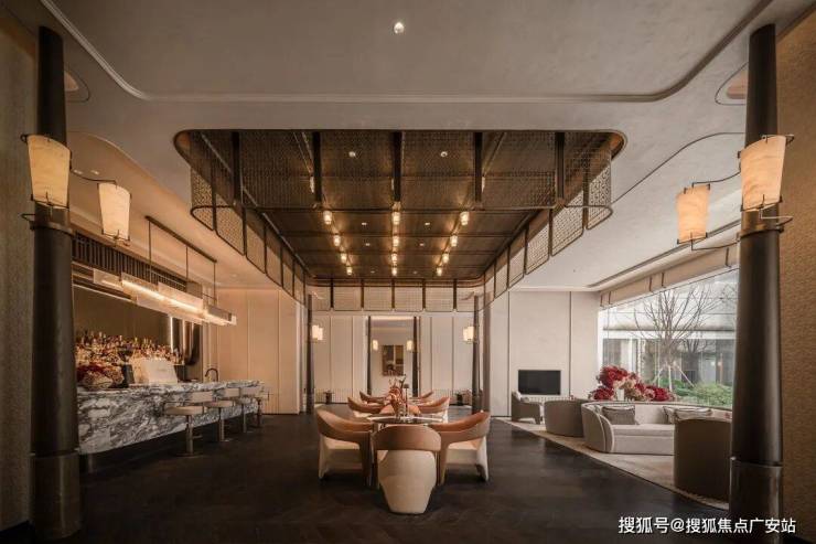 另外,项目首层通过硬朗直线呼应柔和曲线勾勒,辅以温润石材与古铜色金属线条融合,打造东西方美学共融的艺术藏品。