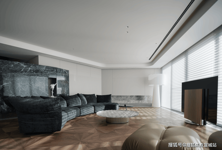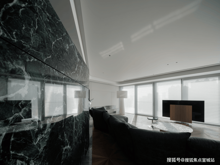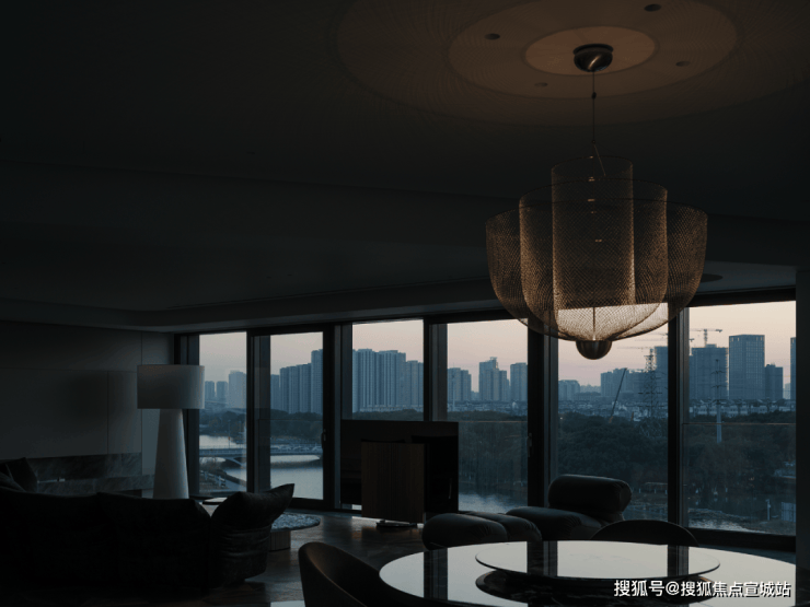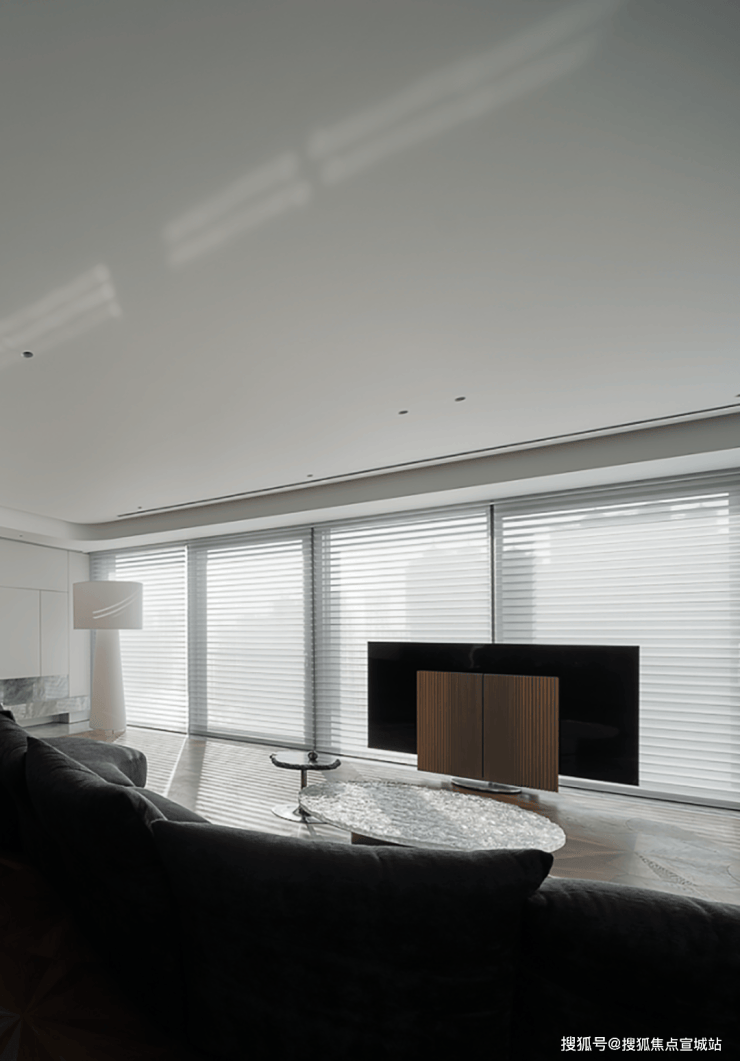 跳脱出固有的客厅设计,让超宽观景落地窗成为电视的天然背景墙,将城市景观置于落地窗内:白天是与秒流动的自然光线,夜晚则是一览无余的现代繁华。
