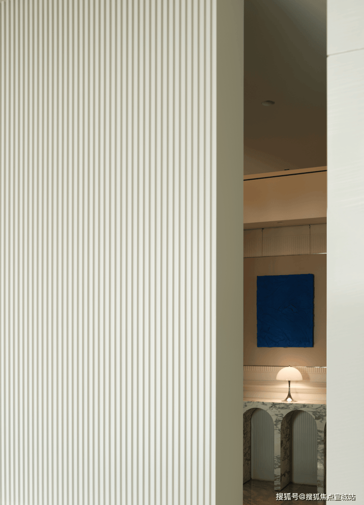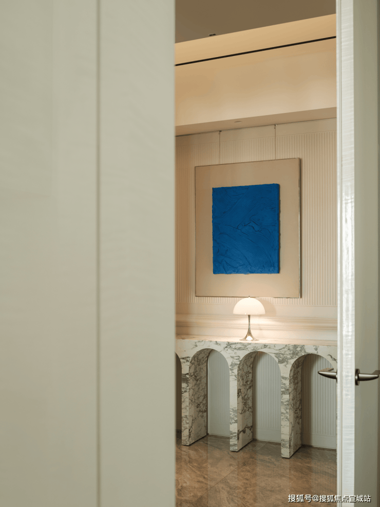 玄关处的大花白大理石端景台完美融入场景,半圆弧线条与美式竖条纹墙面和谐共生。由设计师和业主夫妻三人共同创作的装饰画,灵感来源英国抽象艺术家杰森·马丁的画作,厚重而又细腻的纹理为空间注入艺术灵魂,克莱因蓝的点缀为整个空间增添一抹亮色。