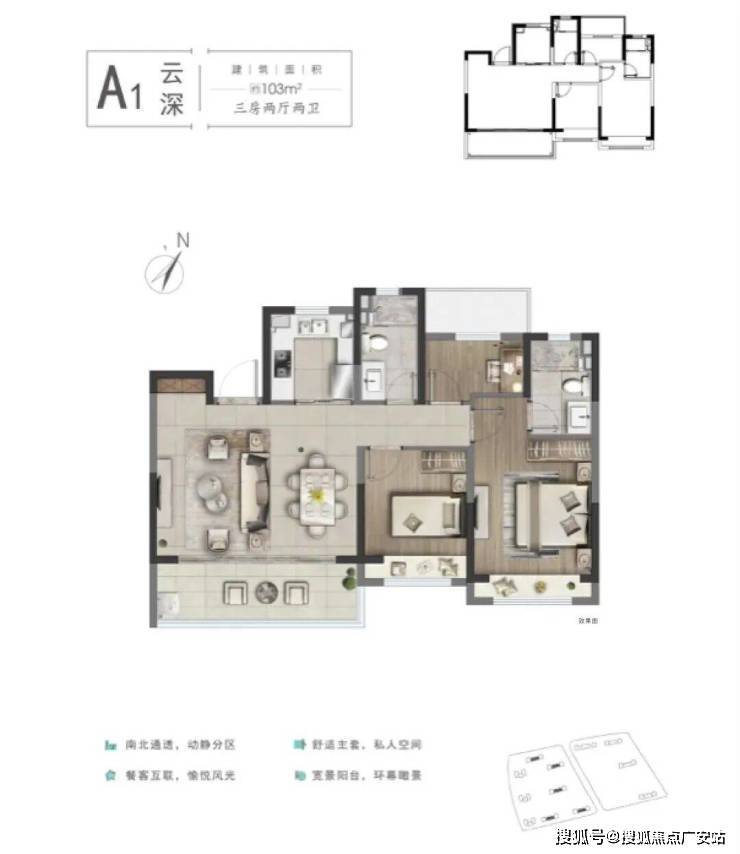 建面约103㎡,三房两厅两卫,三开间朝南,主卧套间飘窗设计。约5.4米宽厅,目前高新区客户较为偏爱小户型大横厅设计的户型