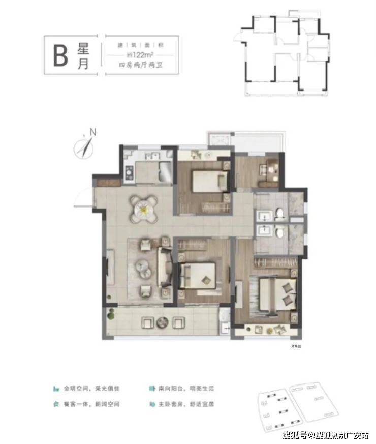 建筑面积约122㎡,四房两厅两卫,全明通透,三面采光,环幕观景。约6.7米宽景阳台,双卧飘窗设计,独立功能间,为生活带来更多可能。