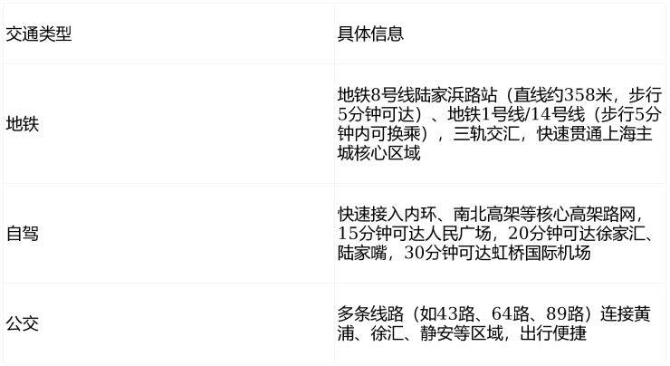 🚇三地铁交汇便捷通勤:向西358米直达地铁8号线陆家浜路站,步行5分钟内可换乘地铁1号线、14号线;15分钟可达人民广场、徐家汇,20分钟可达陆家嘴、虹桥国际机场