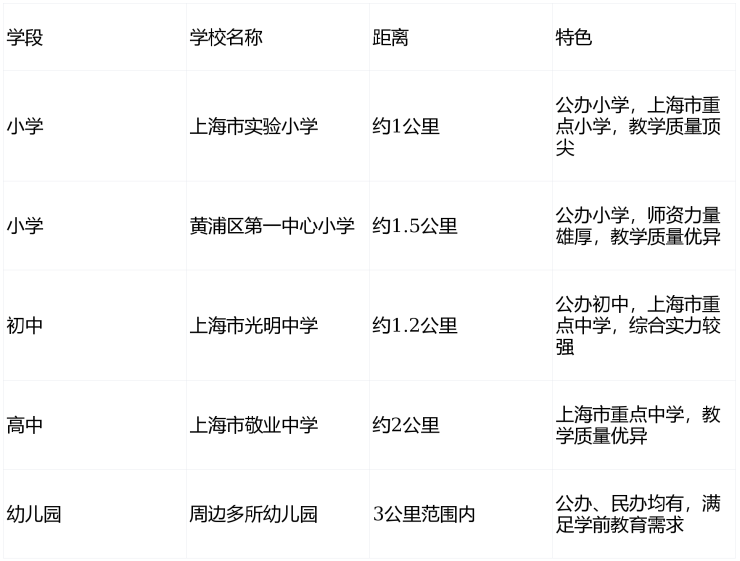 🏫优质教育资源聚集:周边3公里范围内汇聚46所幼儿园、28所小学、15所中学,包括上海市实验小学、上海市光明中学、上海市敬业中学等,均为黄浦区知名学校,教育资源丰富