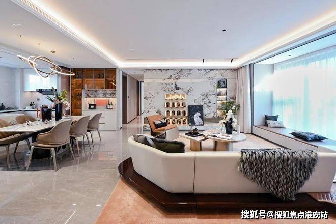 The show flat adopts the style of "waterfront elegant luxury · comfortable livability", with 3.1-meter floor height and super large window-wall ratio for all units, delivered with high-end hardcover. Selecting first-line brands such as Fotile kitchen appliances and Kohler sanitary ware, the 165 ㎡ large flat features independent entry and a 6.2-meter giant screen wide living room, integrating intelligent security system, balancing spatial spaciousness and living practicality, interpreting high-end waterfront life.
