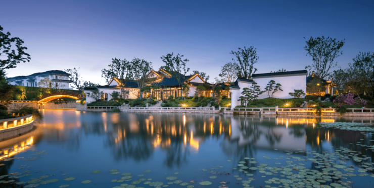 外部生态环境有多优越,自不用再多赘述。更值得关注的是项目的内里,项目与周边低密生态环境的一脉相承,对标古镇中式风格,在文脉传承和风格打造上的天衣无缝。