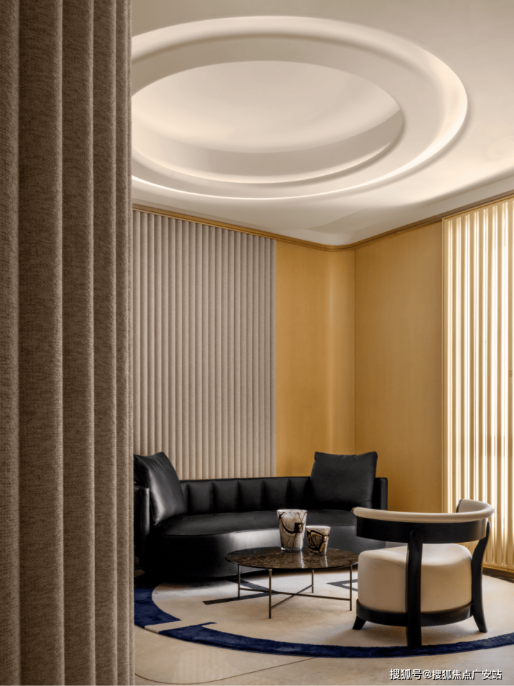底部以石材和金属结合的曲线异形巨柱抬高建筑体量,构筑了廊柱与动态景观空间,既满足了尊贵的入户大堂需求,又释放了底层空间的潜力,进一步提升了低层住宅的采光效果和视野范围,从而营造出更为宜人的居住环境。