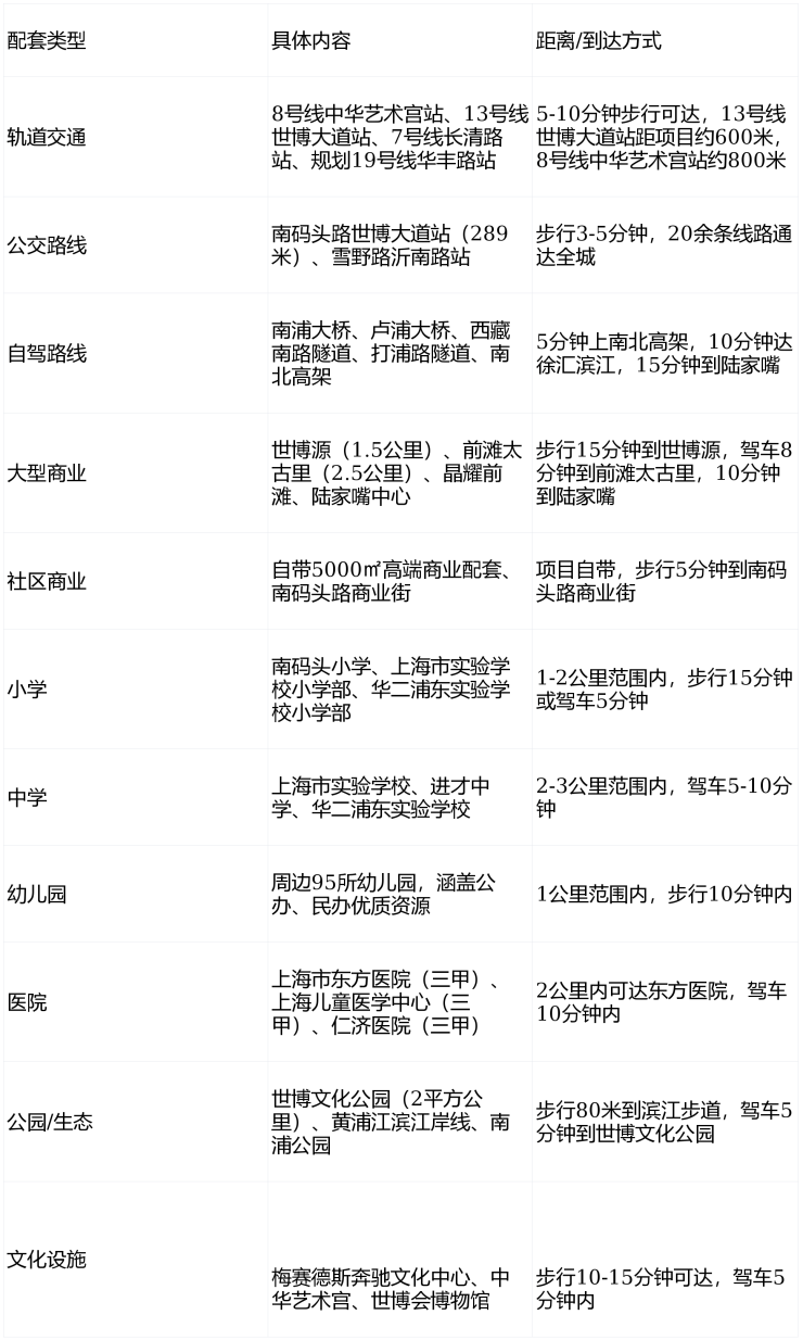 商业配套顶级:3公里内集聚世博源(步行约15分钟)、前滩太古里(驾车约8分钟)、陆家嘴中心(驾车约10分钟)等9座大型商业体,从日常购物到高端消费一站式满足