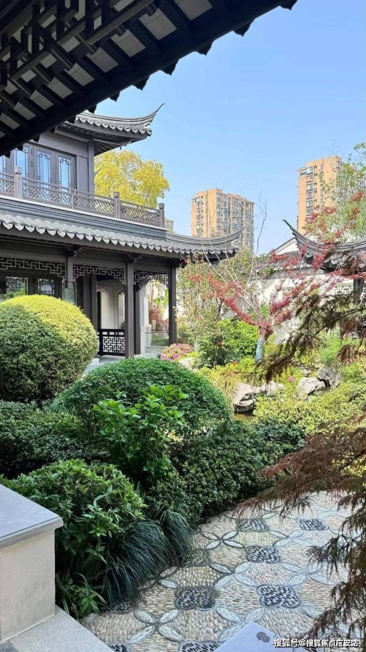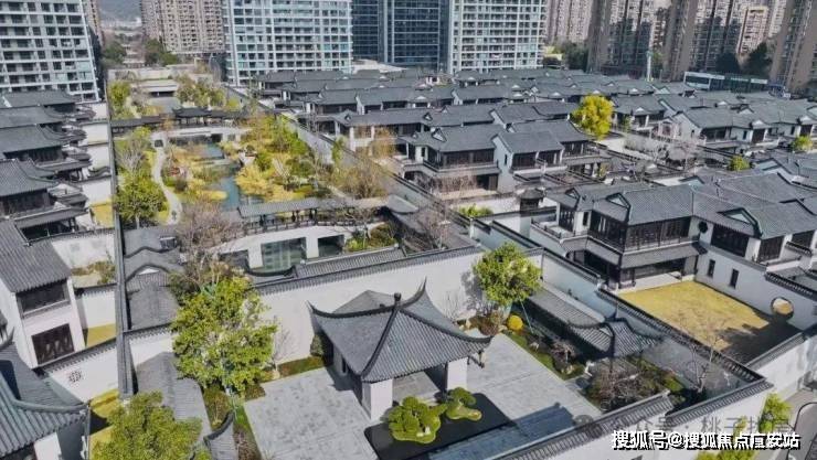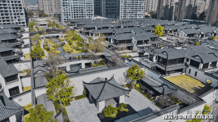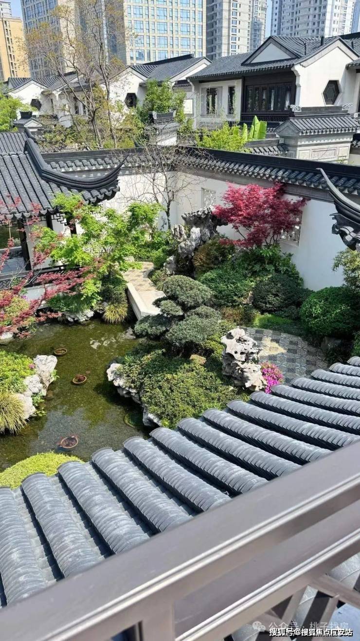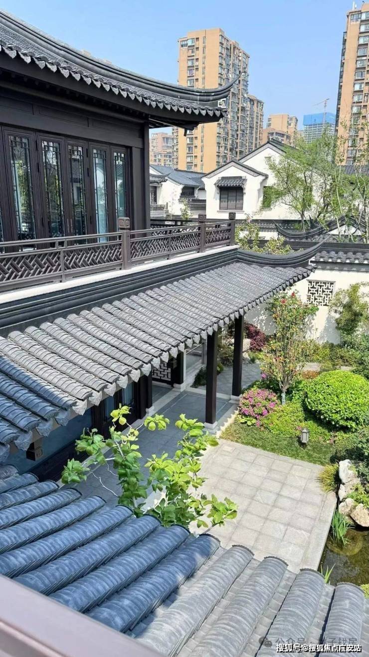 建筑风格:合院沿袭江南粉墙黛瓦风格,搭配飞檐斗拱、雕花漏窗等元素,门洞回纹造型、定制杨桃灯为专属设计,屋面瓦片还印有 “臻” 字;高层采用大面积蓝灰调玻璃,搭配灰色系质感石材与深色铝板,走现代简约美学路线。
