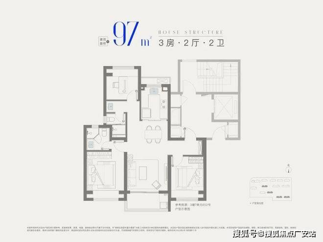 建面约97㎡3房2卫,升级版大3房,入户玄关+主卧套房设计,整体私密性更强,空间更为宽敞。