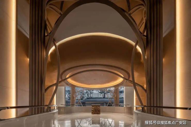 大门内外两重门厅景墙运用月光米黄石材近1000 方,搭配香槟金金属线条,汲取爱马仕全球旗舰店的双曲面叠墙造景手法,增加景墙奢华质感。
