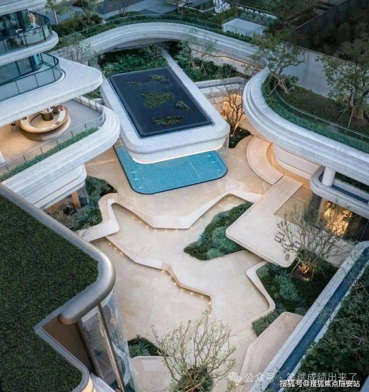 因项目整体抬高,从下沉庭院到架空层“空中花园”的落差极大,形成独特的峡谷地貌,杭序府的设计团队汲取九溪烟树为造园灵感,打造一个立体多维的城市溪谷交互园林;因项目毗邻江岸,杭序府的外立面以“站立的江潮”为灵感,大面积弧形玻璃与四层堆叠的石材线条,将钱塘江潮的千钧之力和流水之韵凝练于建筑肌理之中。