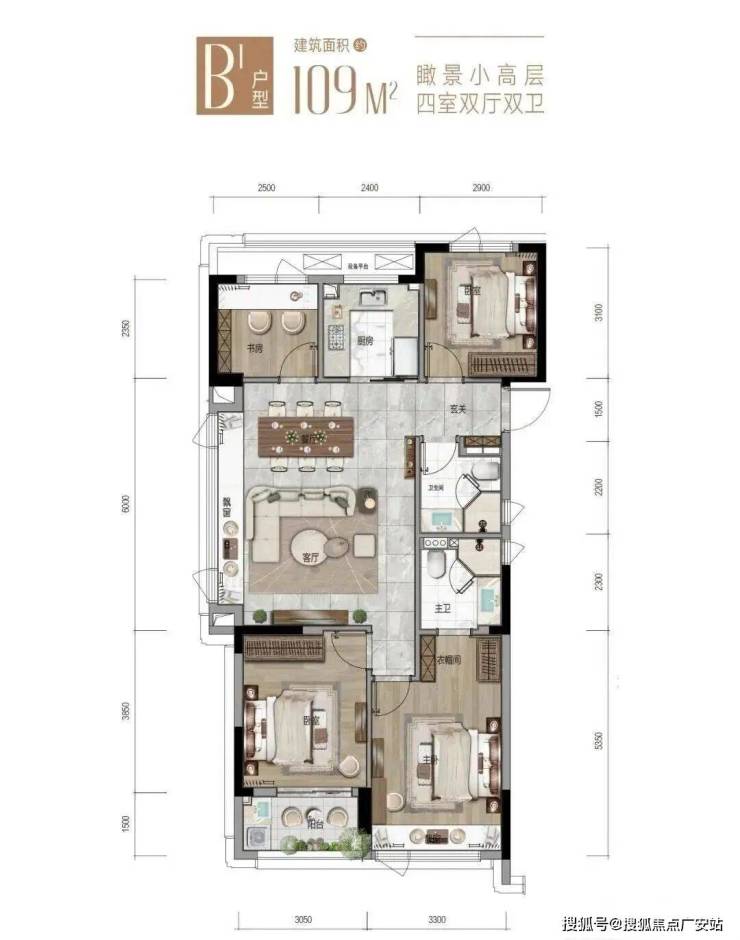 以小高层建面约109㎡的边套为例,居然做到了四房。这是充分考虑到了孩子上学后的住房需求,因为老人很可能要住过来照顾孩子,一家三代人,四房肯定要的。