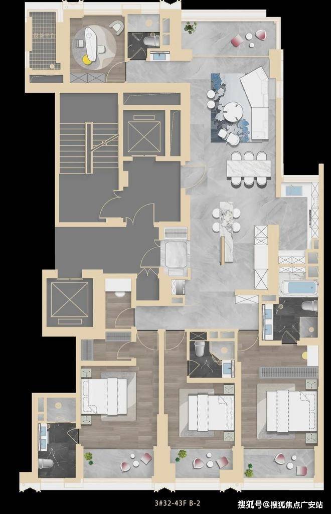 项目中心坐落的中央景观规模约3000㎡,周边环绕着四座建筑,其中三幢为超高层设计,整体布局高低兼顾,启承有序,开阖有度,塑造城市云端生活新方式。