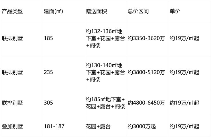 在售产品:建面约185-305㎡联排别墅,约181-187㎡叠加别墅