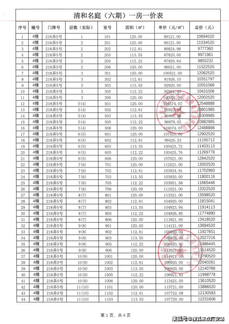 前期一房一价表公示 :