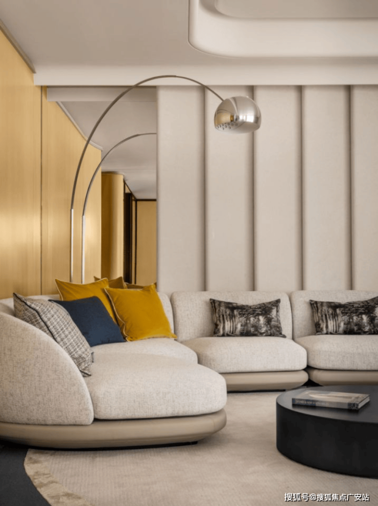 客厅空间采用大量造价昂贵的弧面设计,带来更有格调的审美价值: