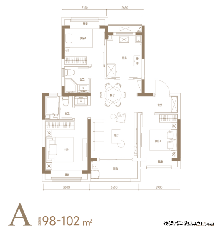建面约100㎡是实打实3房,客厅宽度达3.6米,主房间宽达3.3米,连北面小房间也能放1.5米宽的床。