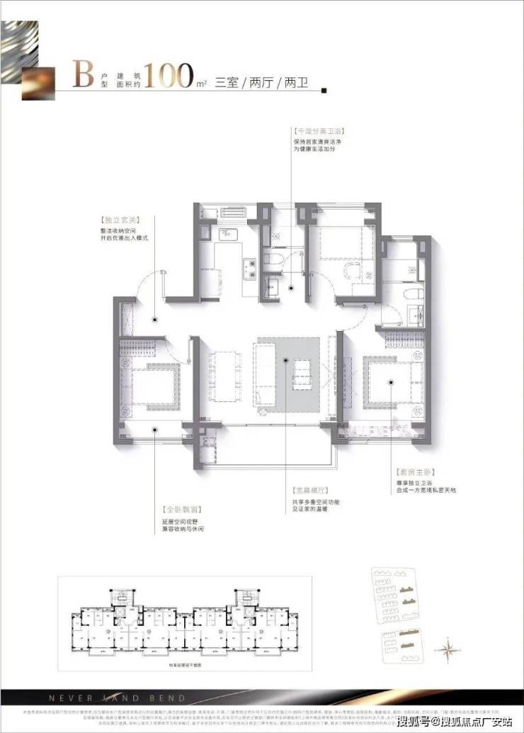 项目建面约100㎡3房2卫仍然是优秀的飞机户型,但实现该面积段少见的大面宽横厅设计!