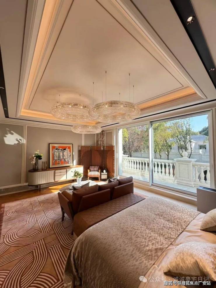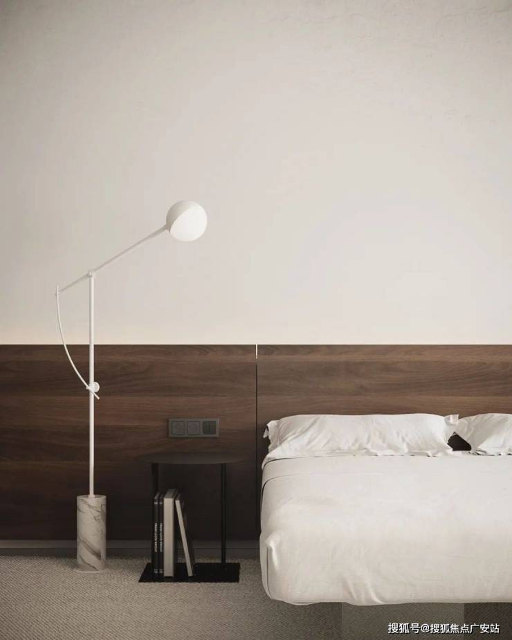 The bedroom is designed with white as the main color scheme, which makes people feel clean and tidy, creating a relaxing atmosphere. The spherical chandelier has geometric aesthetics, presenting a minimalist style. The various areas in the bedroom are divided perfectly, giving people the best living experience.