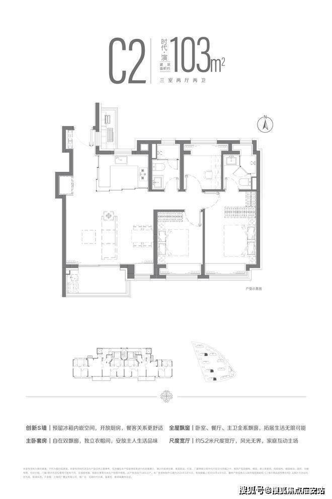 建面约103m²三房两厅两卫户型,南北双卧L型270°揽境飘窗设计,更大限度地让自然融入与自在之中,更宽阔的空间尺度,让自在生长与自然之中。